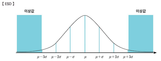 - 평균 ± 3표준편차 벗어나는 값은 이상값