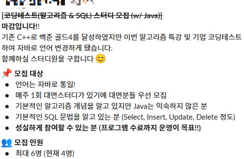 원래는 CS 스터디와 코딩테스트 스터디 두 개를 하려고 생각했지만, 빅데이터 스터디만으로도 벅찰 것 같아서 아쉽지만 CS 스터디는 포기했어요. 대신, 코딩테스트 스터디 하나를 더 개설해서 총 두 개의 스터디를 운영하게 됐어요.