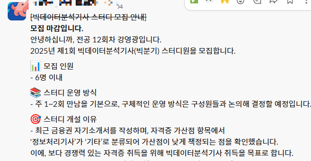 한편으론 자소서 쓰느라 정신없던 시기였는데, 모기업에서 정보처리기사 자격증을 가산점으로 인정하지 않는다는 소식을 듣고 충격... 곧장 방향을 틀어 빅데이터 분석기사를 따야겠다고 마음먹고, 제가 우리 프로그램에서 첫 스터디 모집글을 올린 사람이 됐어요.