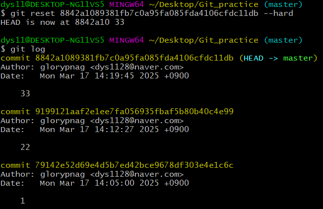 📌 주의: --hard 옵션은 되돌린 이후의 변경 사항을 완전히 삭제!