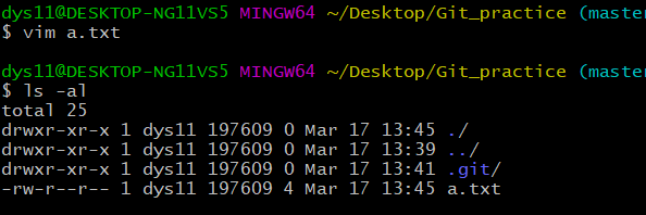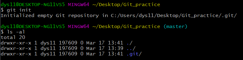 - `$ ls -al`로 `.git` 폴더가 생성되었는지 확인 가능