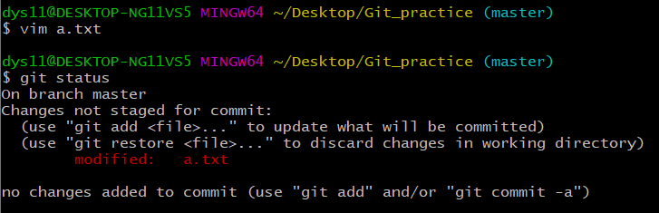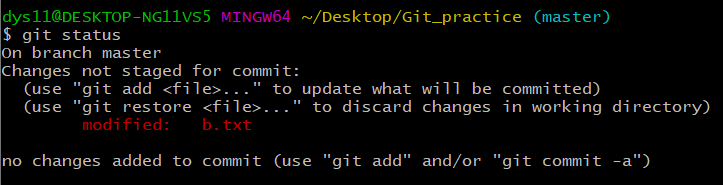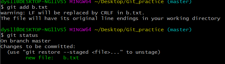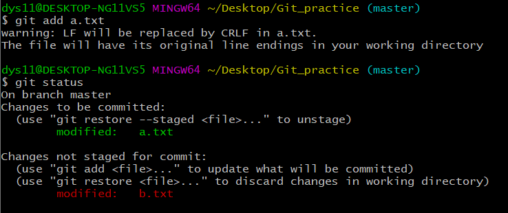 - 이 상태에서 `$git commit`을 해도 a.txt는 커밋되지만 b.txt는 커밋되지 않음