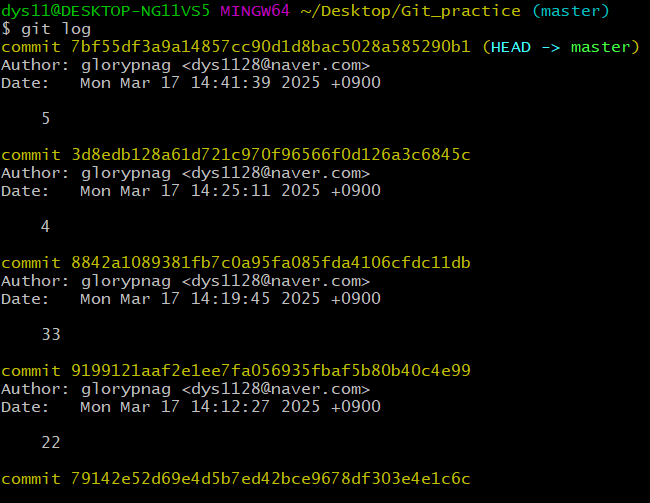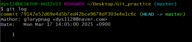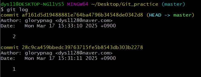 - `$git log`를 사용하면 각 커밋의 고유 id를 확인 가능