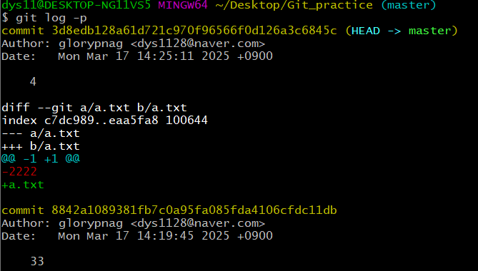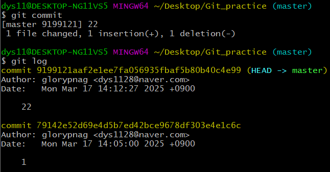 다시 `$git commit`통해 메시지를 '22'로 작성 후, `$git log`