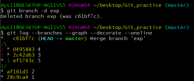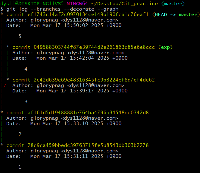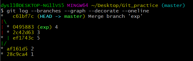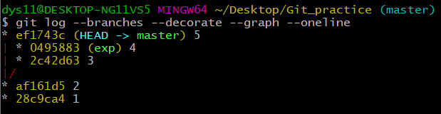 - 두 개의 부모 (2, 4)를 갖는 하나의 커밋이 만들어지면서, master는 5번과 exp의 4번을 모두 가짐