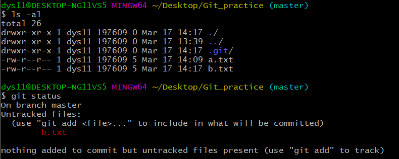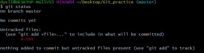 $ git status # 현재 상태 확인 (추적되지 않은 파일 표시)
