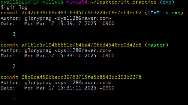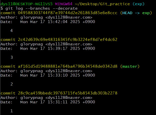 - master의 가장 최신 커밋이 '2' , exp의 가장 최신 커밋이 '4'