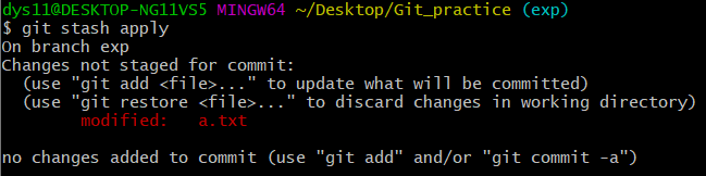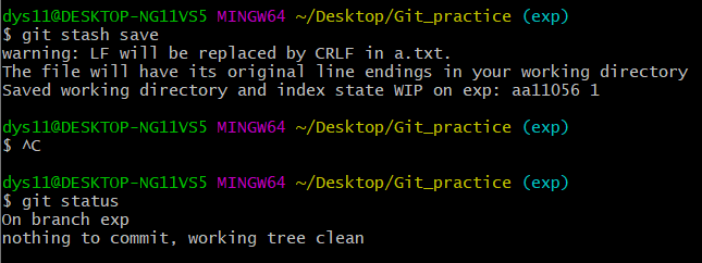 $ git stash save # 작업중인 변경 사항들을 exp 브랜치에 세이브