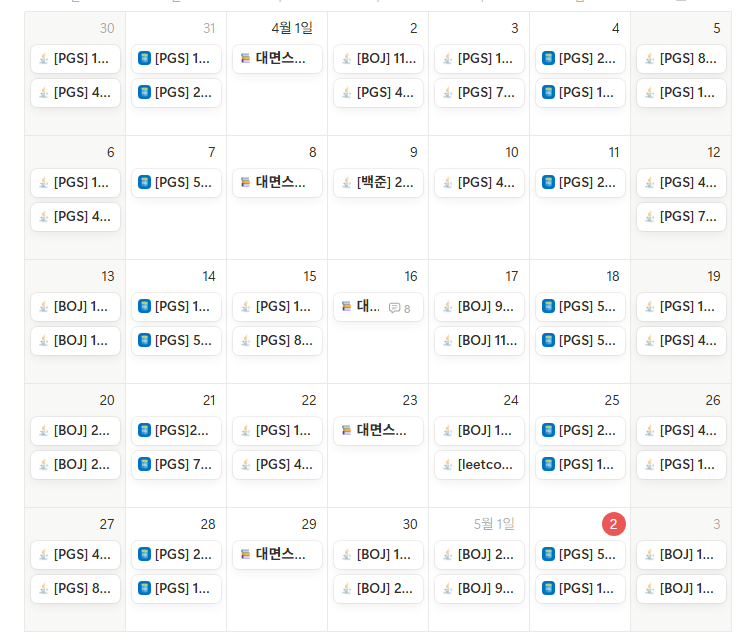- 같이 하는 코딩테스트 스터디도 순항 중이에요! 우리 스터디는 매일 2문제씩 문제를 풀어야 해요.