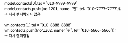 - -> 배열의 내용 변경 시 watcher에게 변경을 알려서 다시 랜더링 발생