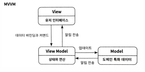 | MVVM | View, ViewModel, Model로 구성 |