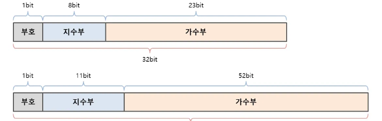 - 64비트(1비트 부호, 11비트 지수, 52비트 가수)