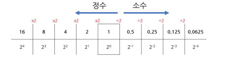 - 소수점 이하는 2의 음의 거듭제곱(0.5, 0.25, 0.125...)을 나타냄