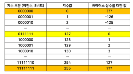 - 그런데 컴퓨터는 부호 없는 8비트로 지수만 저장하려고 함