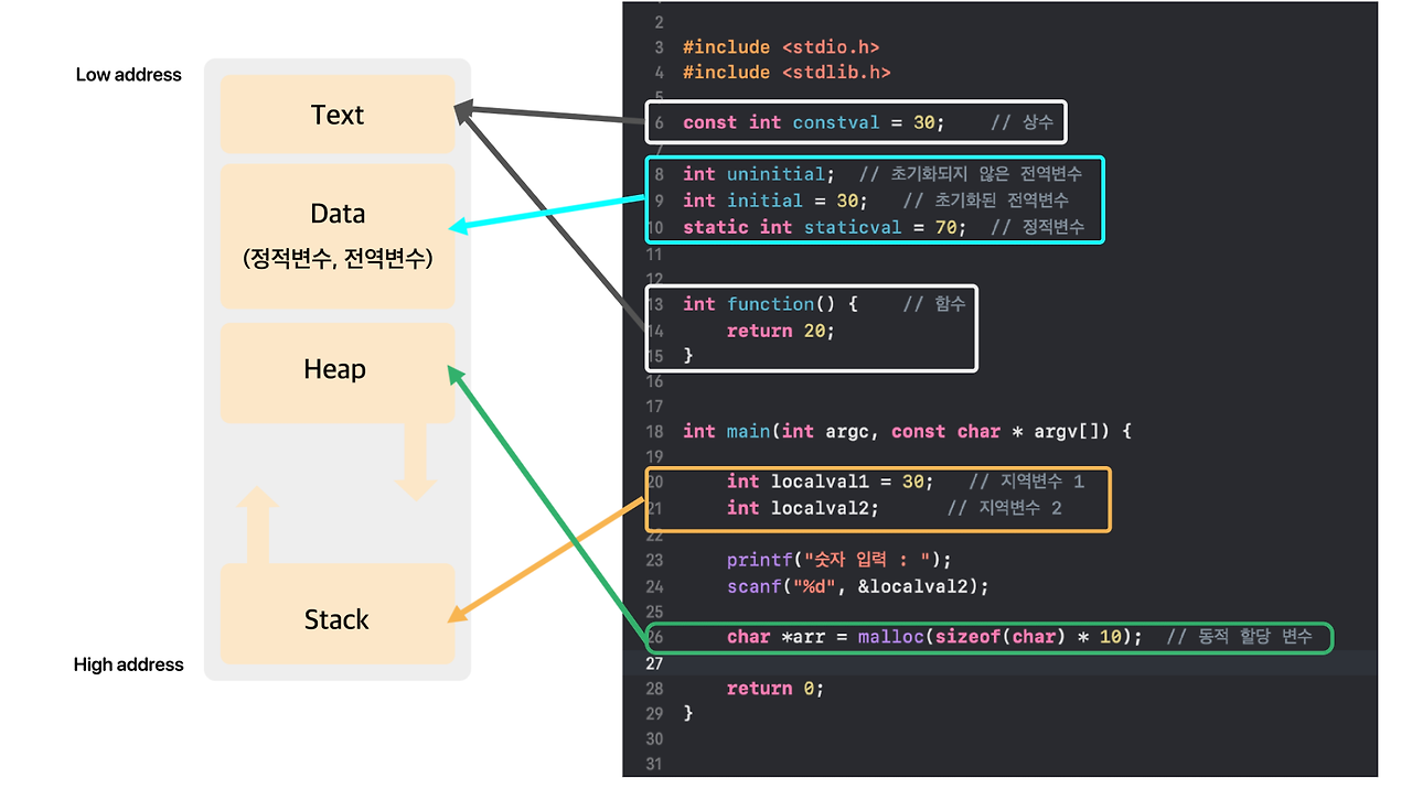 이 구조를 알면, 우리가 작성한 코드가 메모리에서 어떻게 배치되고,
