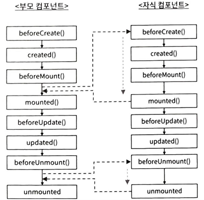 - Vue 컴포넌트는 특정 단계마다 Hook 메서드를 실행할 수 있도록 설계