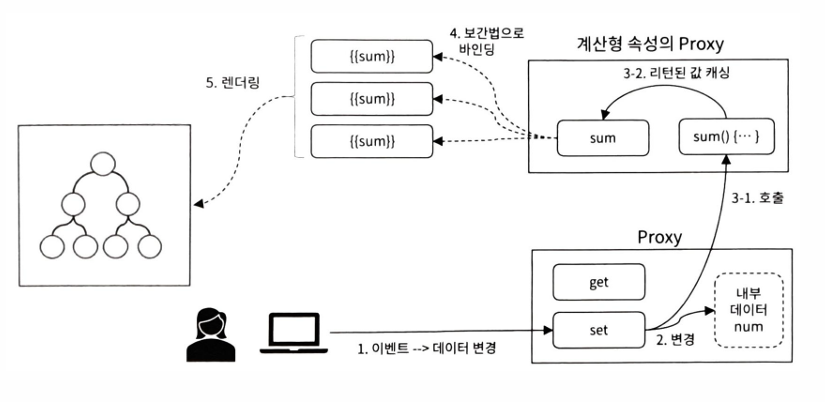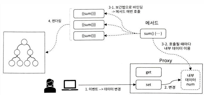 - Vue는 이 데이터를 Proxy 객체로 감싸 실시간으로 변경 사항 감지하여 화면 갱신
