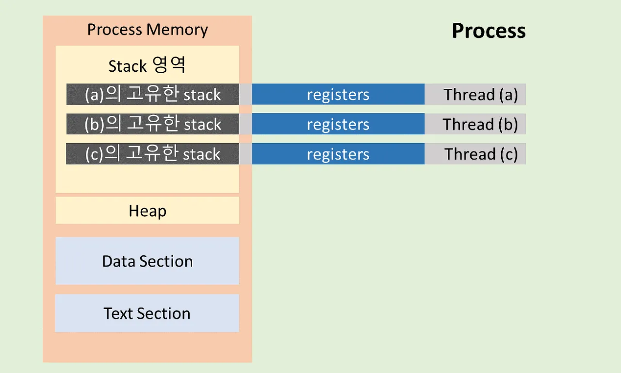 - 데이터 영역: 전역 변수와 정적 변수를 모든 스레드가 접근 가능