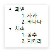 | 중첩 목록 | ul/ol 안에 또 다른 ul/ol |