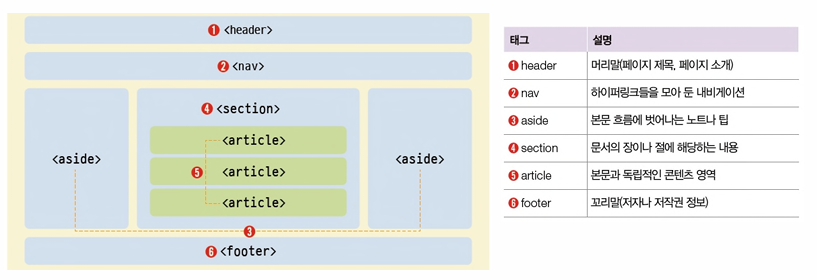| 주요 태그 | `<header>`, `<nav>`, `<section>`, `<article>`, `<footer>` |