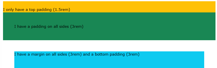 <div class="m-5 pb-5 bg-info">I have a margin on all sides (3rem) and a bottom padding (3rem)</div>