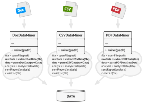 1. 의도템플릿 메서드는 부모 클래스에서 알고리즘의 골격을 정의하지만, 해당 알고리즘의 구조를 변경하지 않고 자식 클래스들이 알고리즘의 특정 단계들을 오버라이드(재정의)할 수 있도록 하는 행동 디자인 패턴입니다.“큰 틀은 부모 클래스가 정하고, 세부사항은 자식 클래스가 채운다.” 어떤 일을 할 때 전체 흐름(순서)은 항상 같지만,그 안에 들어가는 일부 과정은 상황마다 달라야 할 때가 있어요.이럴 때 사용하는 게 템플릿 메서드입니다. 예시: 라면 끓이기🍜 우리가 라면을 끓이는 "알고리즘"은 보통 이렇죠:1. 물 끓이기 2. 면 넣기 3. 스프 넣기 (종류에 따라 다름) 4. 계란, 치즈 등 넣기 (선택) 5. 불 끄기 이 전체 순서는 항상 동일하지만, 스프 종류나 토핑은 사람마다 다르겠죠? 이럴 때, 공..